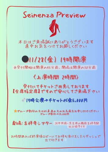 本日11月28日19時公演は当日券ございます✨ 明日の公演、明後日の千秋楽の公演は、残席が残り僅かです。 もしもご検討の方は、タイミング合いましたら、本日の夜公演がオススメです❤️ 飛び込みも大歓迎です お心向きましたら是非是非です✨ 昨日は、私の産まれ…